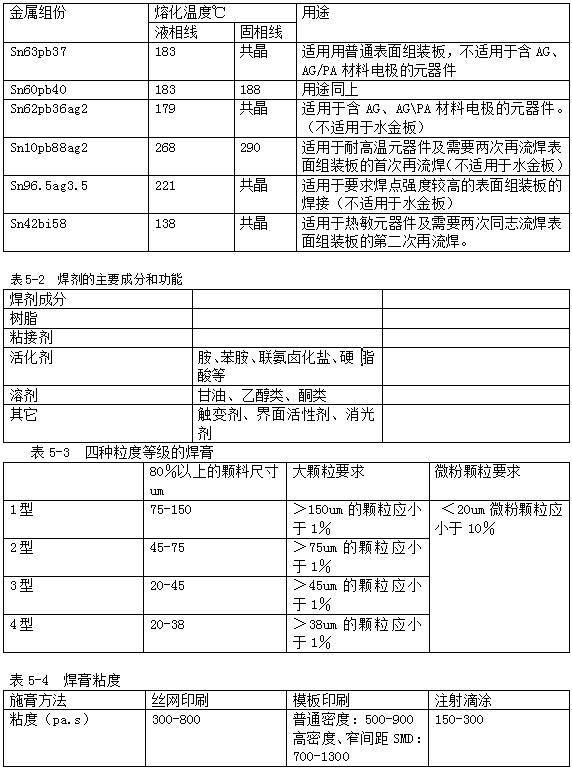 表5-1 常用焊膏的金屬組分、熔化溫度與用途