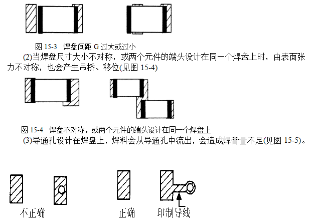 (2)焊盤間足L—確保元件端頭或引腳與焊盤哈當(dāng)?shù)拇罱映叽纭:副P間距過大或過小都會引起焊接缺陷;(見圖15—1)。