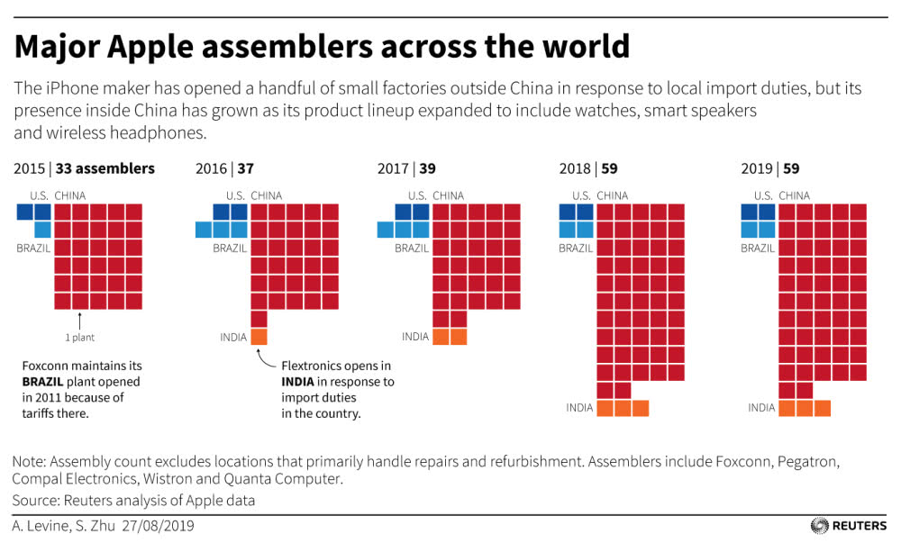 但是在這里產(chǎn)出的蘋果數(shù)量相比全球?qū)μO果的需求而言,只是杯水車薪。路透社 2019 年 8 月經(jīng)過調(diào)查后發(fā)布的報(bào)告顯示,蘋果在印度和巴西兩國生產(chǎn)的產(chǎn)品只是用來滿足當(dāng)?shù)匦枨螅谥袊黾拥奶O果代工廠遠(yuǎn)超過中國以外。